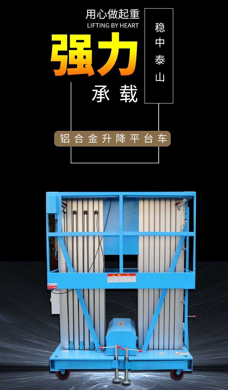 整體采用型材強度高,具有造型美觀、體積小、重量輕、結構緊湊、移動方便、升降平臺平穩、操作方便、安全可靠等優點,令高空作業更方便快捷,能夠快速、慢速行走,可調速,是現代企業高效安全生產之理想高空作業設備。主要產品分為單立柱鋁合金,雙立柱鋁合金,三立柱鋁合金、四立柱鋁合金。